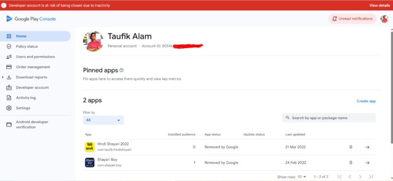 5 Year Old Verified Play Console | 2 App Removed | No Issue