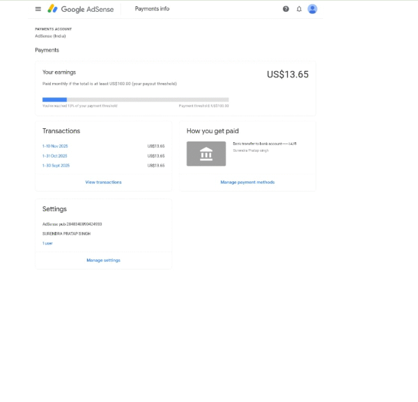 5 Year Old Adsence Account | Pin Verified | 13$ Balance | Ad Manager Not Use