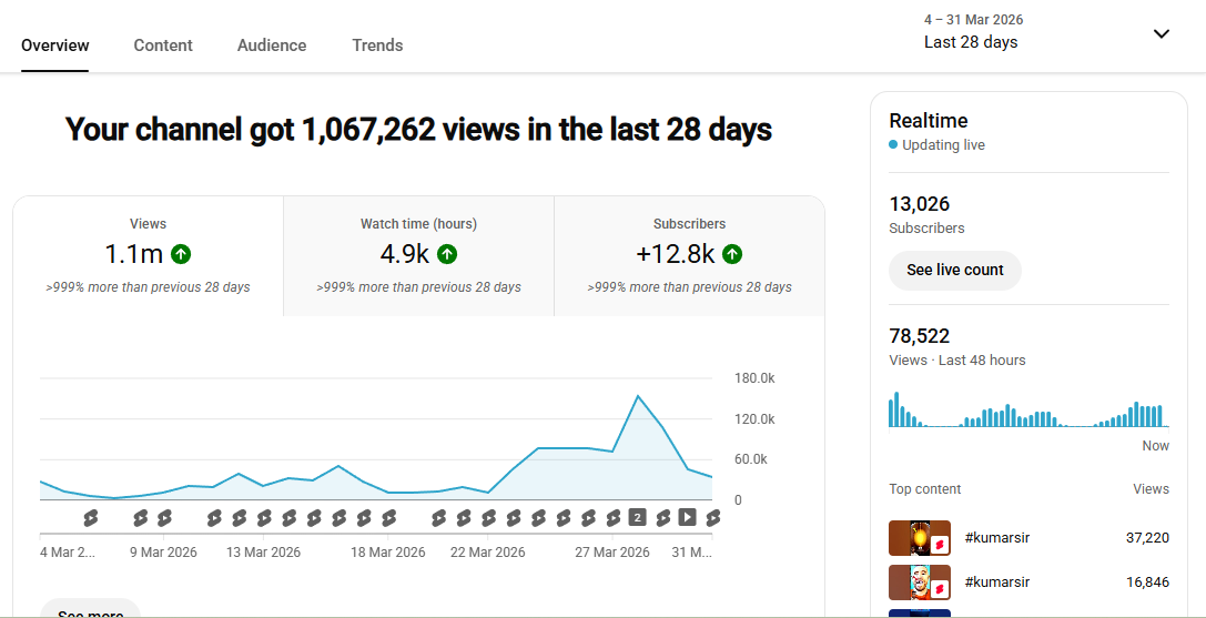 15k+ Subscriber Non-Monetised Channel | 1.1m+ View | No Strike