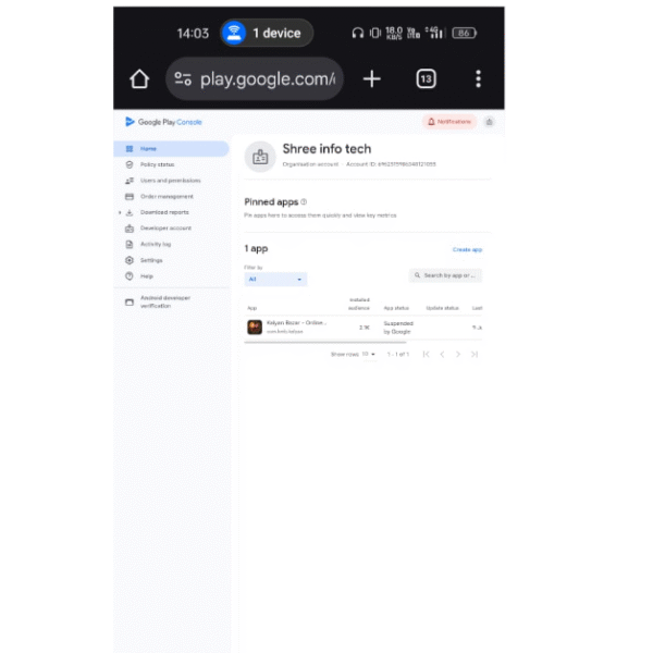 1.5 Year Old Google Console | Identity Verified | 1 App Suspend