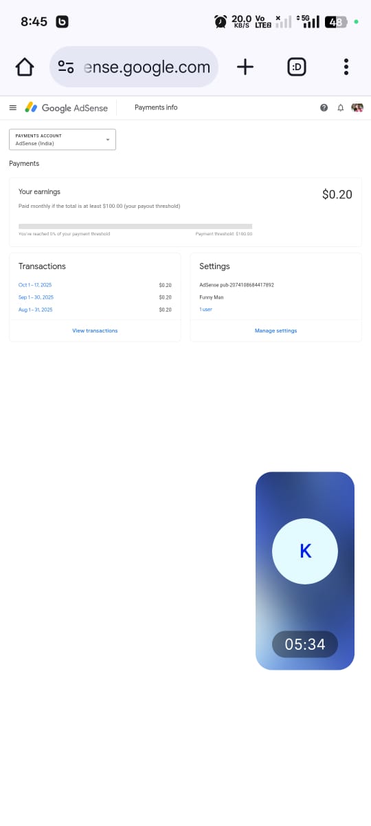12 Payment Received Adsence Account | 5 Year Old | 69$ Balance
